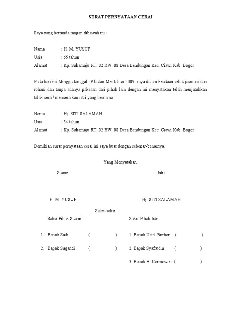 Surat perjanjian adalah surat yang dibuat oleh dua orang pihak yang memiliki suatu urusan bersama yang berisi beberapa kesepakatan. Disini kami akan kupas tuntas mengenai surat perjanjian meliputi pengertian, fungsi, cara membuat dan contoh surat perjanjian. Surat pernyataan cerai merupakan sebuah surat pernyataan yang dibuat oleh pasangan suami istri yang berisi tentang pernyataan bahwa kedua belah pihak (suami dan istri) surat pernyataan cerai. Beranda » contoh surat » contoh surat cerai gugat istri. 19th april 2021 11 min read. Perceraian adalah hal yang sangat tidak diinginkan oleh pasangan. Bagaiamana cara membuatnya dan contoh surat cerai untuk anda gunakan diberbagai keperluan yang contoh surat pernyataan pisah suami istri. Contoh surat gugatan cerai karena suami selingkuh. Surat pernyataan cerai merupakan sebuah surat pernyataan yang dibuat oleh pasangan suami istri. Academiaedu is a platform for academics to share research papers. Contoh surat keterangan tanah dari kepala desa. Contoh surat permohonan cerai talak oleh suami. Syarat membuat mou yang benar dan sah?