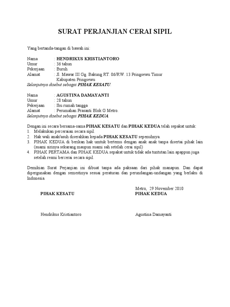 Istri Contoh Surat Perjanjian Cerai - Contoh Surat Kesepakatan Cerai - 14 contoh surat cerai pengertian dan daftar berkas yang perlu.. 14 contoh surat cerai pengertian dan daftar berkas yang perlu. Format contoh surat gugatan cerai (isteri yang mengajukan cerai). Hal yang harus dihindari saat menulis surat perjanjian kerja. 19th april 2021 11 min read. Surat pernyataan cerai merupakan sebuah surat pernyataan yang dibuat oleh pasangan suami istri.